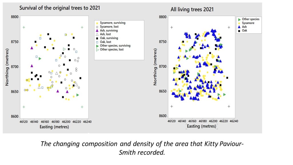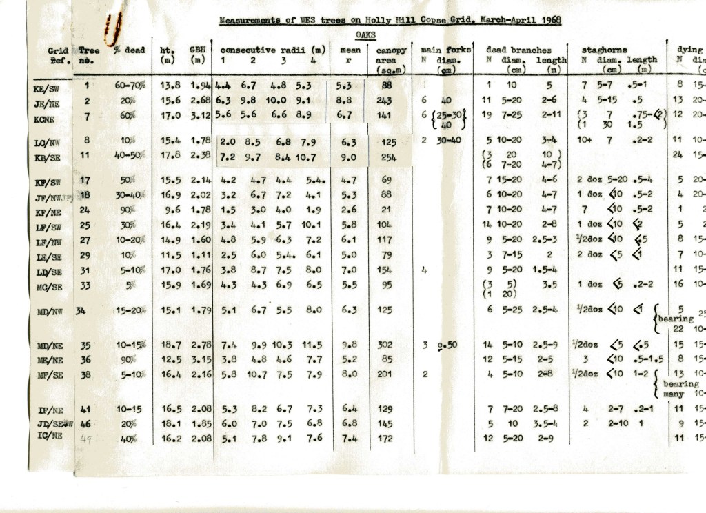 In the early 2000s I was part of a British Ecological Society group visiting Wytham Woods. As we walked down the hill Kitty Paviour-Smith mentioned that she had in 1968 plotted the trees and regeneration over a patch of about a hectare; and she still had the data in notebooks in her attic.