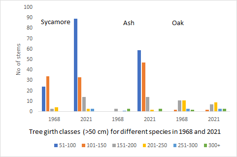 A bigger change was in the number and species composition of the canopy. A strong cohort of ash and sycamore saplings, had been noted in the 1959 management plan for the Woods (probably getting away following the death of the rabbits), and this formed the bulk of the 1968 understorey records. Many of these trees have now grown up into the canopy. There has been no recruitment of oak to the canopy, so its contribution has declined in both relative and absolute terms. The increased deer browsing since the 1970s has also reduced the current understorey density.The different dynamics of the species are seen in the distribution of their size classes. Oak shows a bell-shaped curve with a peak in the larger size classes, whereas both ash and sycamore show much larger peaks in the smaller size classes, typical of expanding populatons.