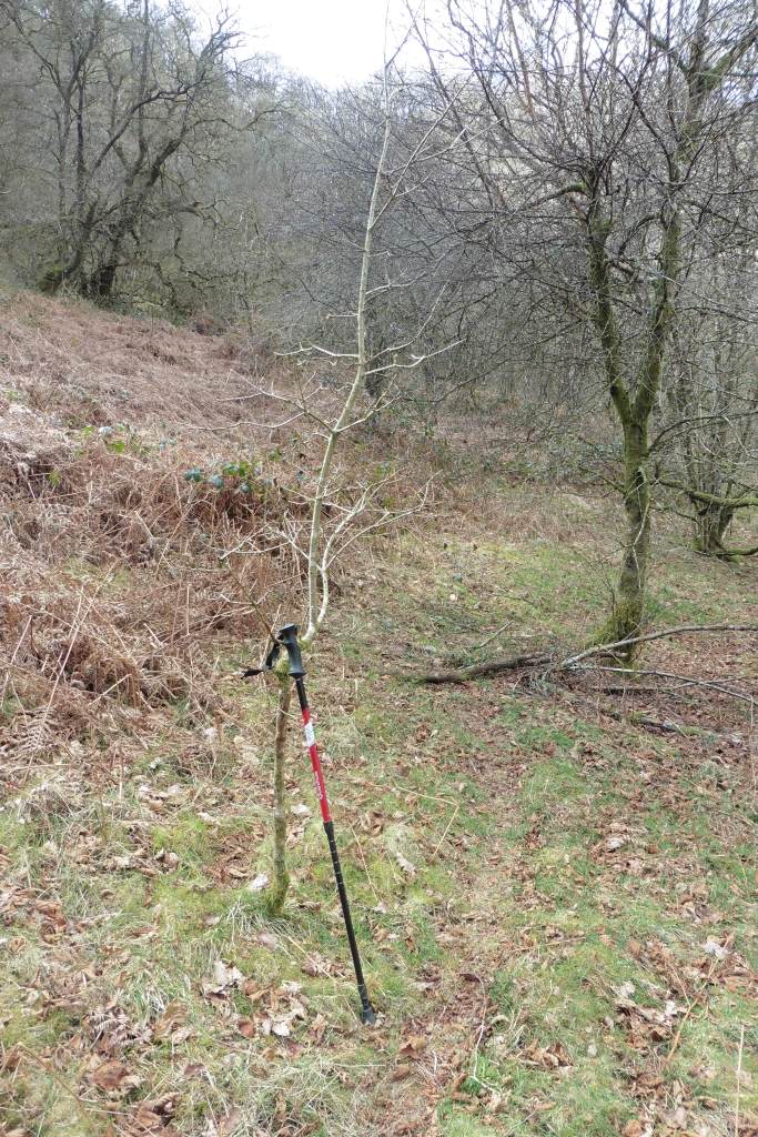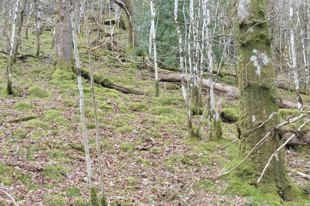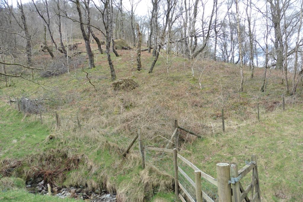 It lies on steep slopes in a narrow valley, accessed by a dead-end road. The approach was made more dramatic by the dark crag opposite, showing the remnants of a recent hill fire. The main block is an oakwood but there were several blocks of slope alderwood which seems to be a common component of British uplands: perhaps the expansion of alder in prehistory seen in the pollen record also involved alder spread away from the riversides with which it is usually associated.