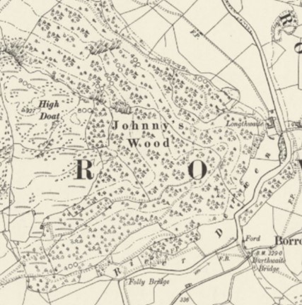 Johnny’s Wood Cumbria, NCR Gr.1, SAC, SSSI on the 1897 six-inch map, showing conifer symbols, and in 2021.