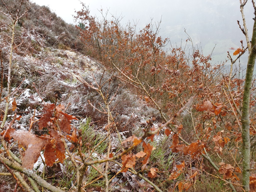 In Wales the highest oakwood is probably that near Abertillary, described by Rackham and Keen (2022), but they also note the strange ‘ground oaks’ growing high above the Rhondda valley. They are certainly exposed and my recent visit unfortunately coincided with a snowstorm.