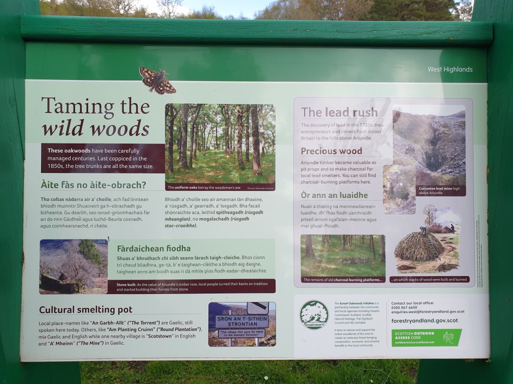 Back across to the west coast for the third oakwood – Ariundle National Nature Reserve (NM8464) part of the Loch Sunart Oakwoods SAC. Like the other two sites I had visited it in the 1980s but my memories of that visit were rather hazy. However I seem to remember walking along a track to reach the reserve with a rather forbidding stand of conifer to my right. Much of the surrounding land was Forestry Commission and wood production was a priority here. Now the stand has been cleared and the focus is on the reserve, its biodiversity and history.