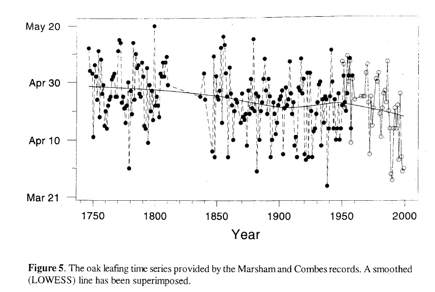 While I could accept that climate change was important, I was initially sceptical as to whether it was going to make much difference to woods and woodland conservation in my lifetime. A talk in 1999 by Tim Sparks on phenology of woodland species, which included a graph of the change in oak leafing times (below) changed my mind – effects could already be seen now (Sparks 2000).