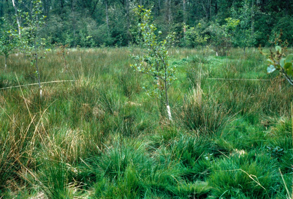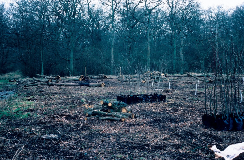 A Buckinghamshire stand immediately after felling; the subsequent rise in the water table led to a profusion of rushes, sedge and tufted hair grass.